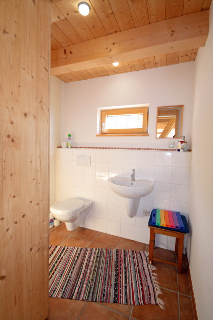 Holz-Esstisch mit 6 Stühlen und gemütlicher Couch; separates WC mit Handwaschbecken,