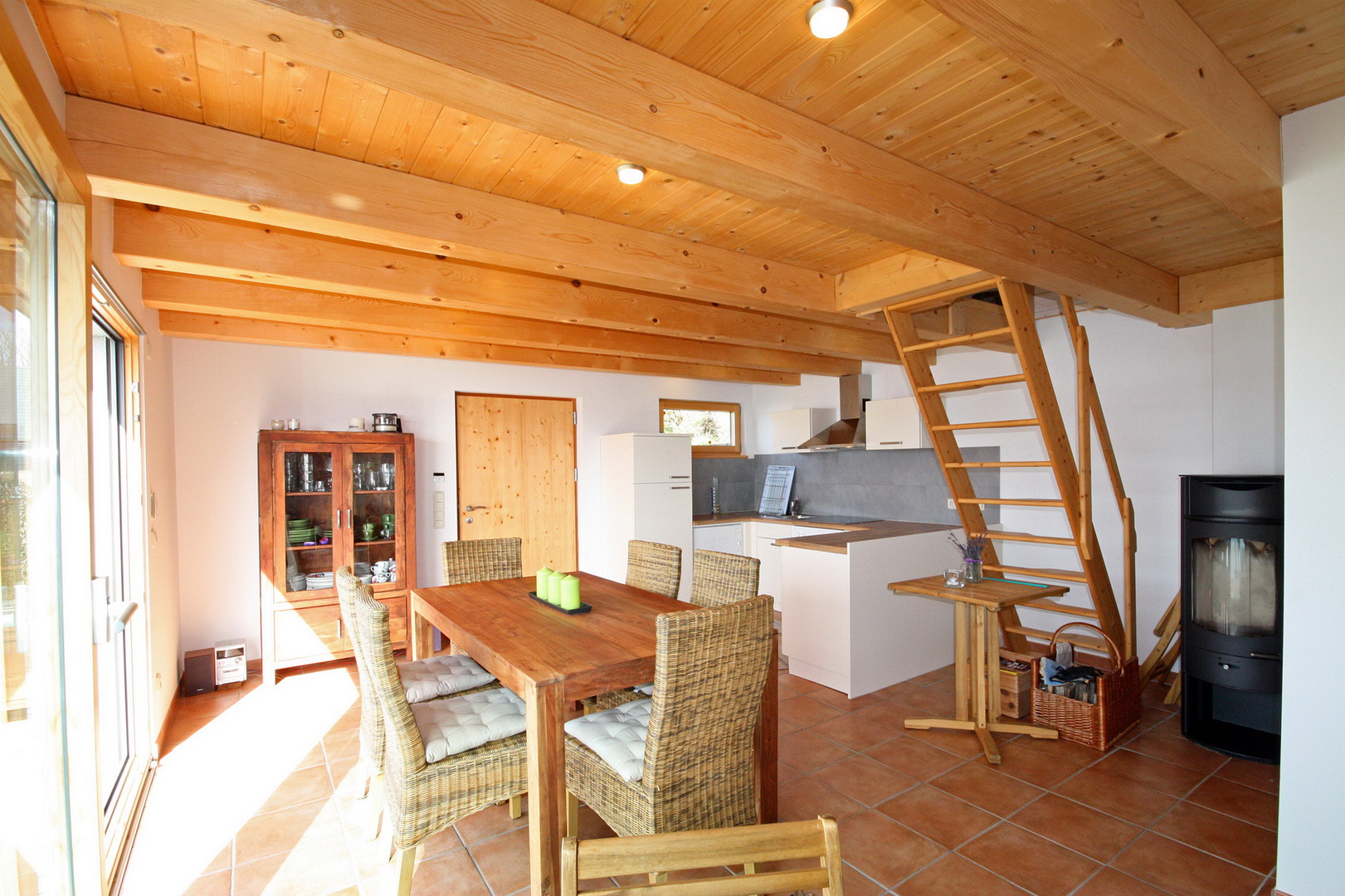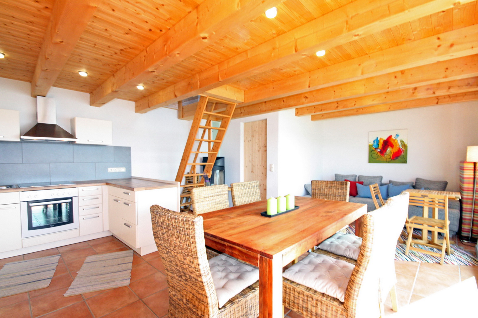 großer Wohn-Koch-Essbereich mit dänischen Kaminofen; Einbauküche samt E-Geräte (Backrohr,