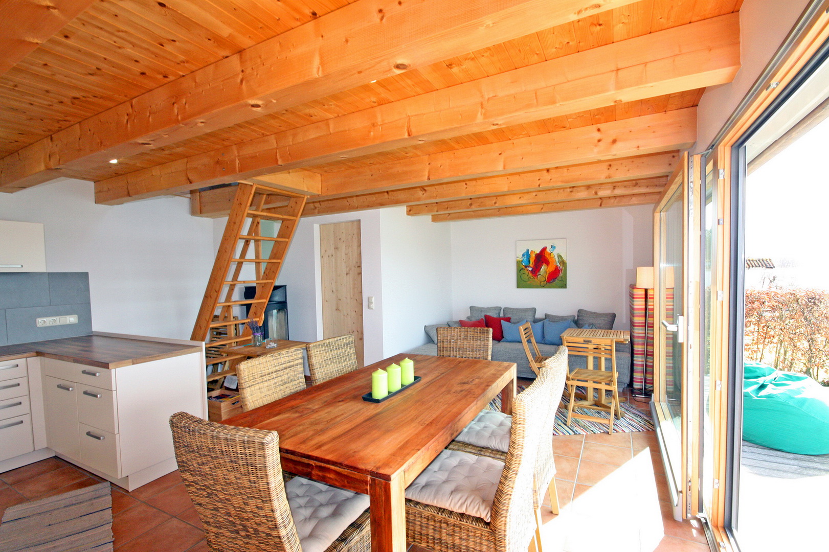 Fliesenboden; Eingangs- u. Innentüren aus Vollholz; Holztramdecke; lichtdurchfluteter ca. 30m²